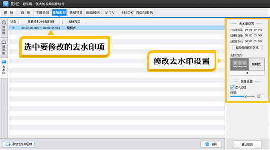 在“叠加素材”面板点击“去水印”栏目,在去水印效果列表中,选中需要修改的去水印效果,即可在其右侧“去水印设置”栏目,对去水印效果进行修改。设置完毕后,点击“确认修改”按钮即可。