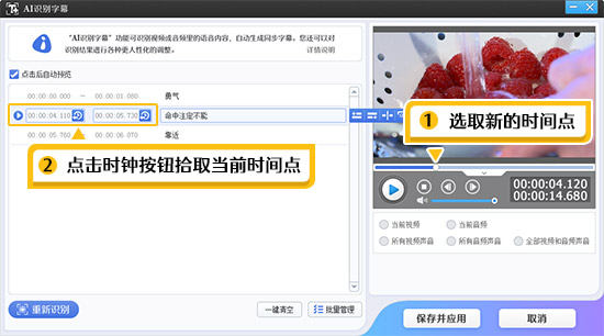 在“AI识别字幕”对话框,鼠标左键选中需要修改的AI字幕条项,该AI字幕条项则会处于可编辑状态,在该AI字幕条项最前方,带箭头的时钟圆圈处,显示了该AI字幕的开始时间和结束时间,在右侧视频预览框的时间进度条上,重新选择新的时间点,再点击开始时间或结束时间处的时钟小按钮,即可拾取当前时间点,修改AI字幕的开始时间或结束时间。